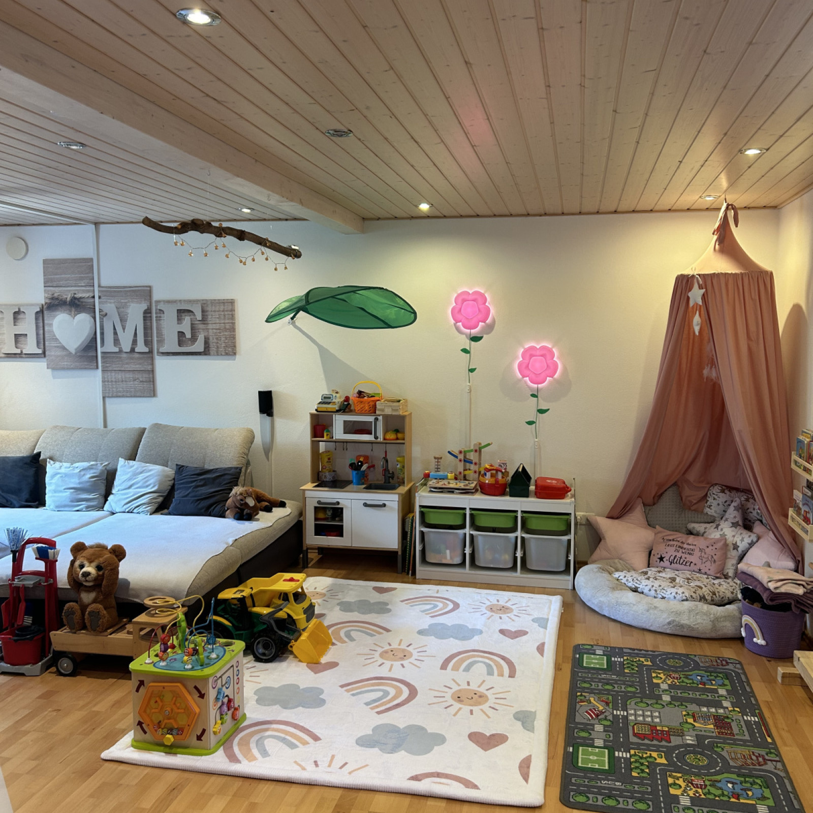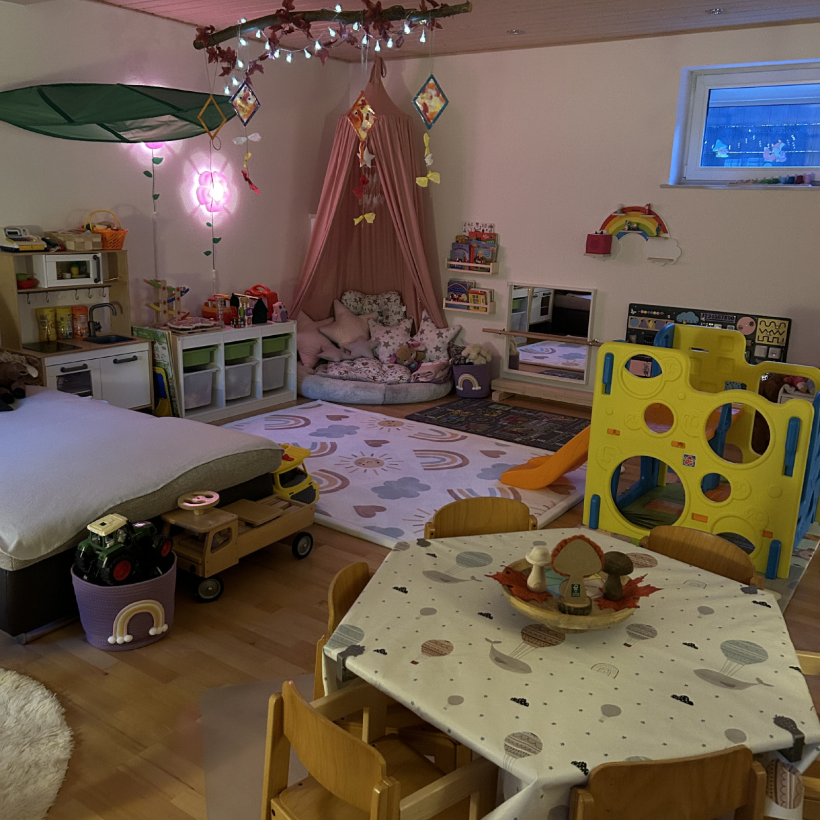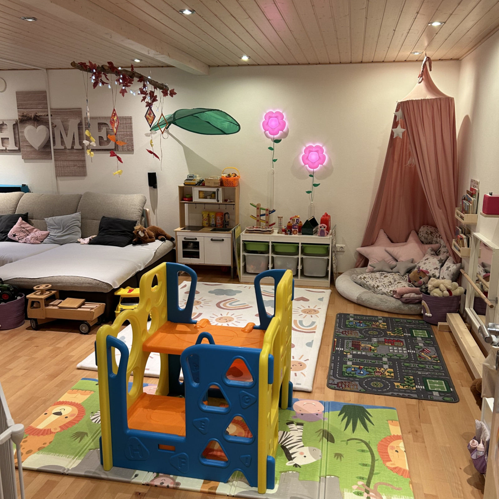 eine Spielküche, ein Montessori-Lernboard, eine Kuschelecke und vieles mehr finden.