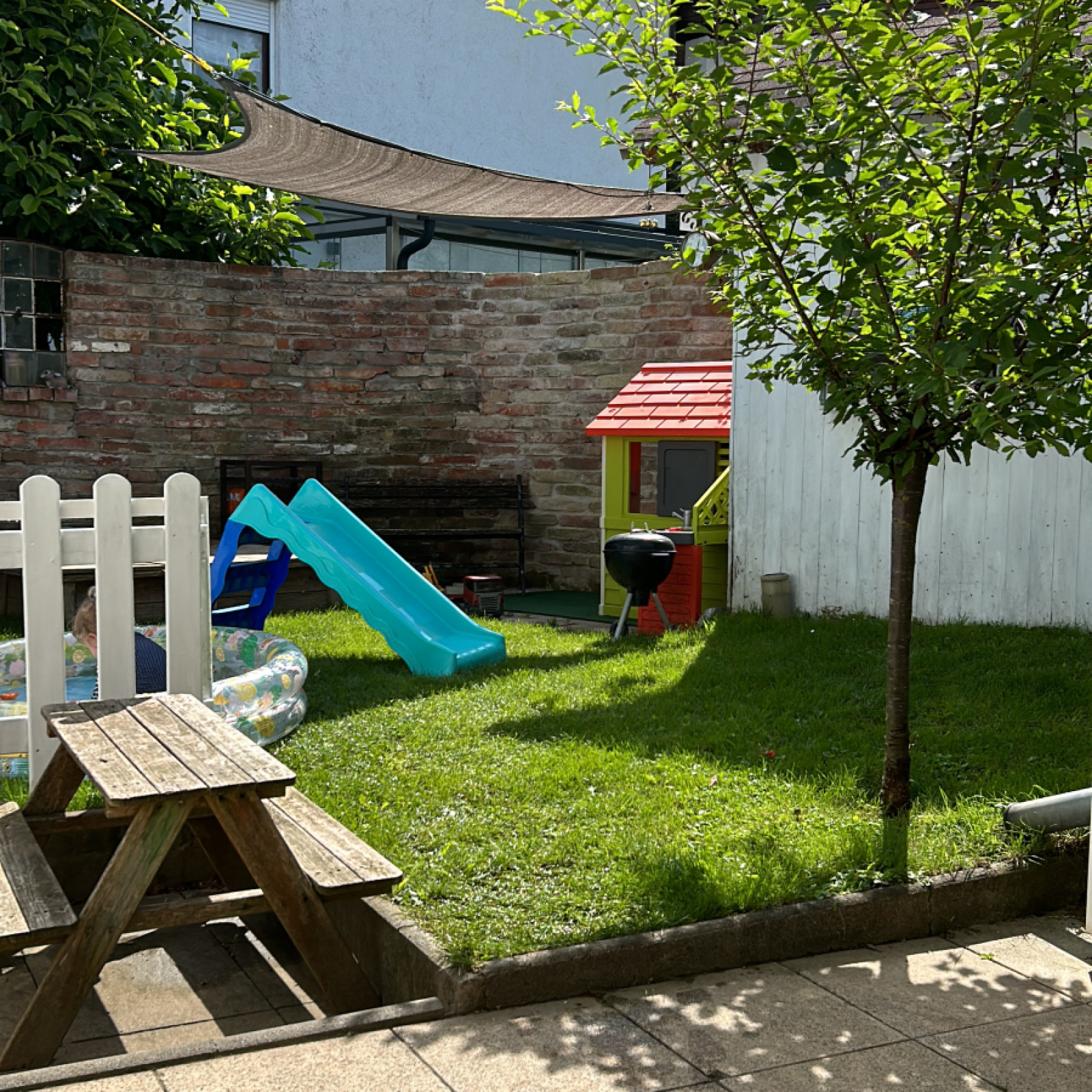Zur Verfügung stehen ein großer Sandkasten, eine Rutsche, eine Matschküche und ein Spielhaus.